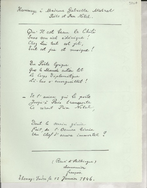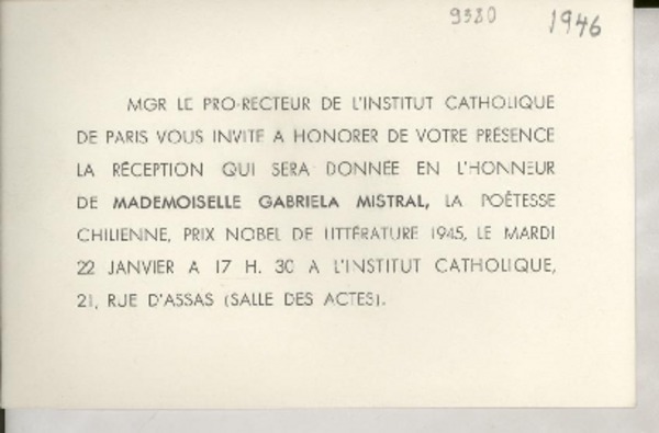 [Tarjeta] [1946] [mars], [Francia] [a] [Gabriela Mistral] [manuscrito] De un amigo.