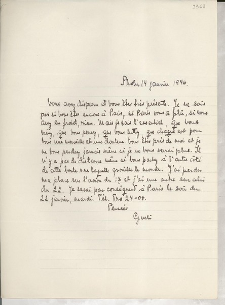 Tarnac y Paris, Francia [a] Salvador Reyes Cartas, entre 1940 y 1945, [manuscrito] Francis de Miomandre.