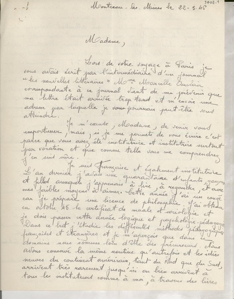 Correspondencia - Mistral, Gabriela - Manuscritos franceses - Maucuer, Aimé