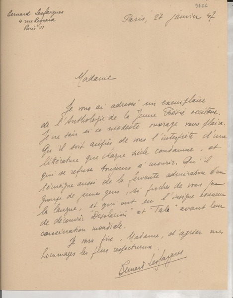 Reyes, Salvador - Autores franceses - Manuscritos franceses - MacOrlan, Pierre - Correspondencia - Autores chilenos