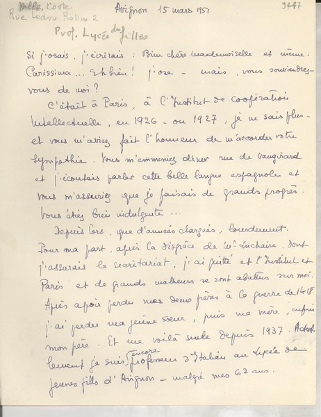 [Carta] 1932 oct 15, Vedéne, [Francia] [a] Gabriela Mistral [manuscrito] M. Marmottan.