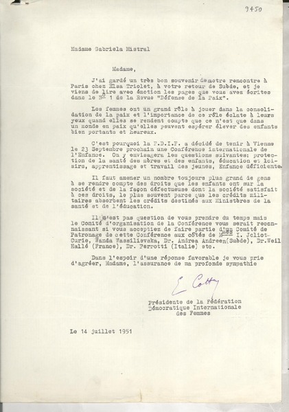 [Carta] 1933 juil 1, Paris, [Francia] [a] Mademoiselle Gabriela Mistral [manuscrito] D. Braga, le secrétaire général.