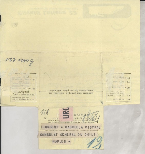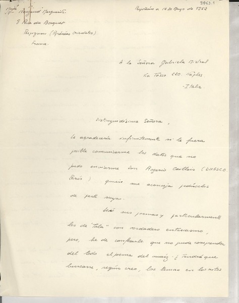 [Telegrama] 1952 sept. 19, Paris, [Francia] [a] Gabrielo [i.e. Gabriela] Mistral, Nápoles, [Italia] [manuscrito] [Roger] Caillois.