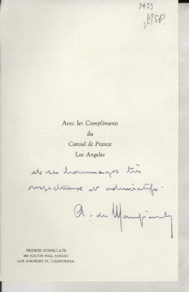 [Tarjeta] [1945?], [Francia] [a] Gabriela Mistral, [Francia] [manuscrito] Henri Laugier.