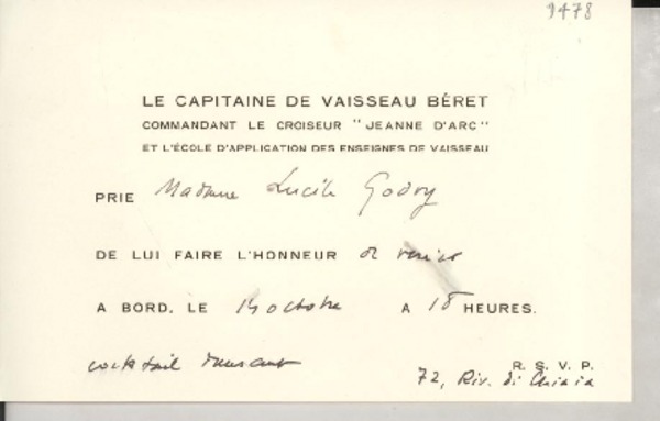 [Tarjeta] 1952 oct. 14, Italia [a] Lucila Godoy [manuscrito] El Capitan de Vaisseau Béret.