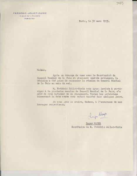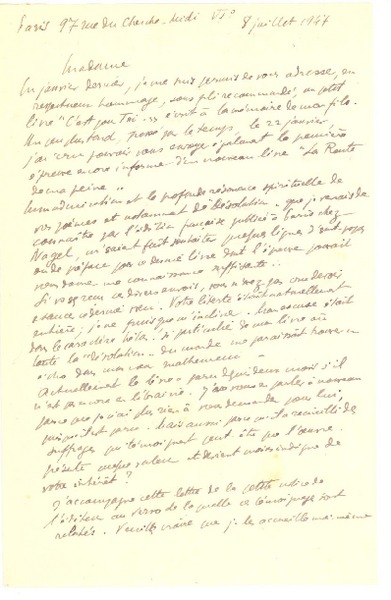 Paris, Payrac y Richelieu, Francia [a] Salvador Reyes Cartas, desde marzo a diciembre de 1948, [manuscrito] Francis de Miomandre.