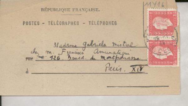 [Recibo] 1946 janv. 28, Paris, [France] [a] Gabriela Mistral, Paris, [France] [manuscrito] République Française Postes - Télégraphes - Téléphones.