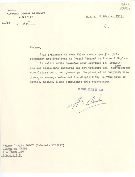 [Tarjeta] 1952 juin 14, Naples, [Italia] [a] Lucila Godoy [manuscrito] Albert Chambon y señora.