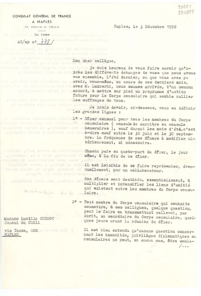 [Telegrama] 1952 nov. 18, Paris, [Francia] [a] Gabriela Mistral, Naples, [Italia] [manuscrito] Les Letress Françaises.