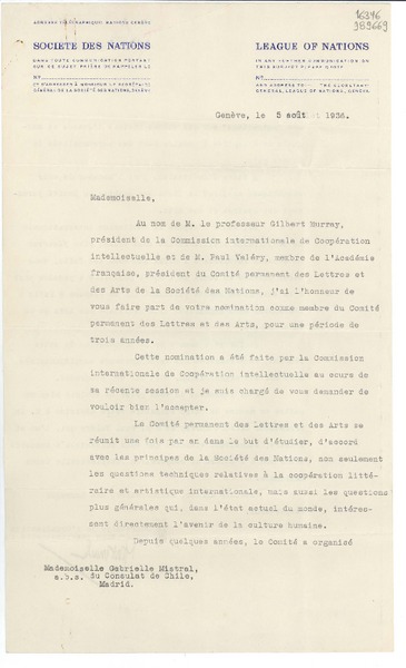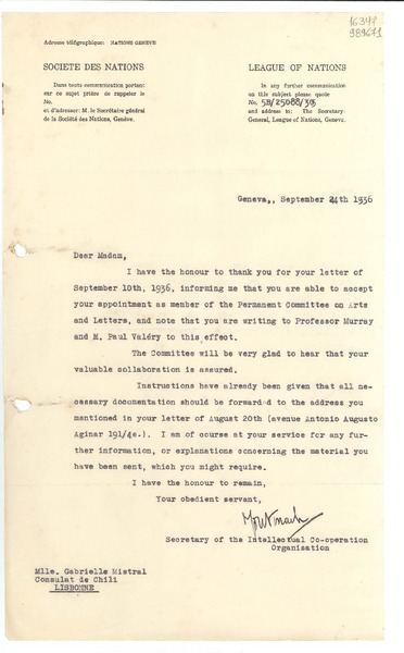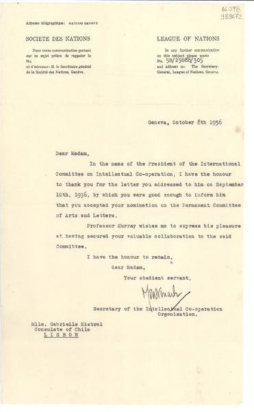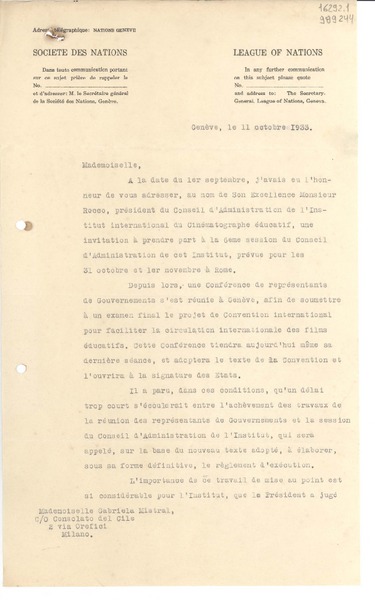 [Carta] 1933 oct. 11, Genéve, [Suiza] [a] Mademoiselle Gabriela Mistral, Consolato del Cile, Milano [manuscrito] Le Secrétaire de l'Organisation Internationale de Coopération Intellectuelle.