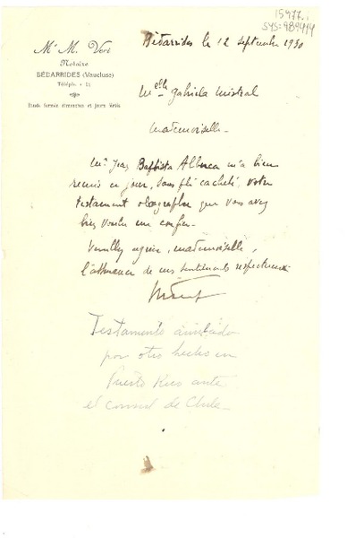 [Carta] 1930 sept. 12, Bédarrides, Vaucluse, [Francia] [a] Gabriela Mistral [manuscrito] M Vert.