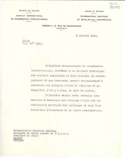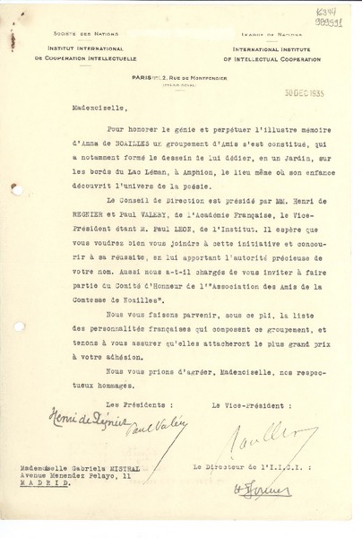 [Carta] 1934 déc. 4, Paris, 2 Rue de Montpensier, [France] [a la] Mademoiselle Gabriela Mistral, Consul du Chili à Madrid, Consulat du Chili, Madrid, Espagne [manuscrito] D. Secrétan, Le Secrétaire général.