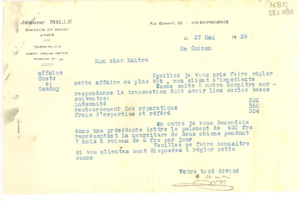 [Carta] 1929 mai 27, Aix en Provence, [Francia] [a] Mon Cher Maitre [manuscrito] Jérome Mille.