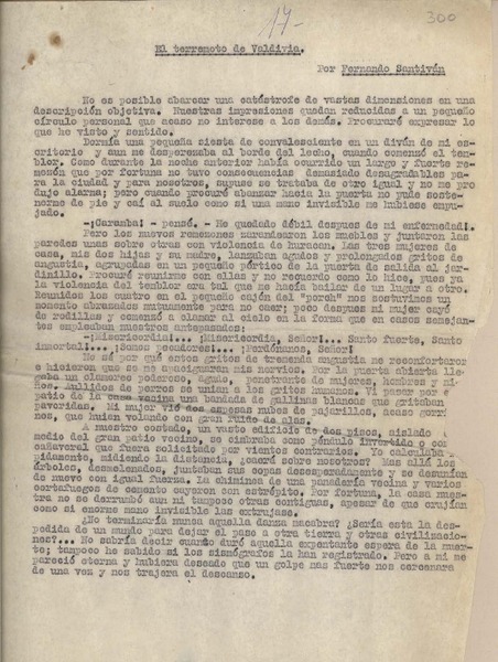 El terremoto de Valdivia [manuscrito] Fernando Santiván.