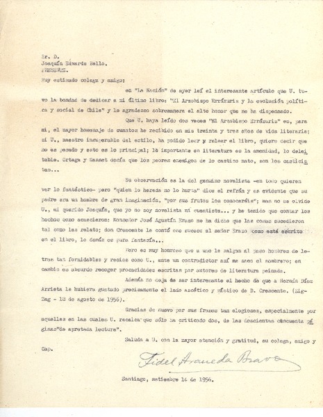 [Carta] 1956 sep. 14, Santiago, Chile [a] Joaquín Edwards Bello [manuscrito] Fidel Araneda Bravo.
