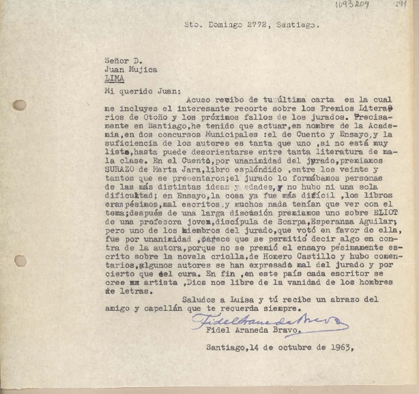 [Carta] 1963 octubre 14, Santiago, Chile [a] Juan Mujica de la Fuente, Lima, Perú [manuscrito] Fidel Araneda Bravo.