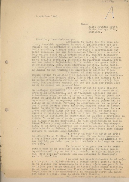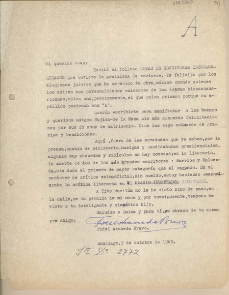 [Carta] 1963 octubre 3, Santiago, Chile [a] Juan Mujica de la Fuente, Lima, Perú [manuscrito] Fidel Araneda Bravo.
