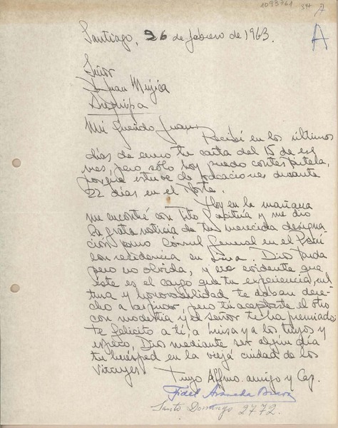 [Carta] 1963 febrero 26, Santiago, Chile [a] Juan Mujica, Arequipa, Perú [manuscrito] Fidel Araneda Bravo.