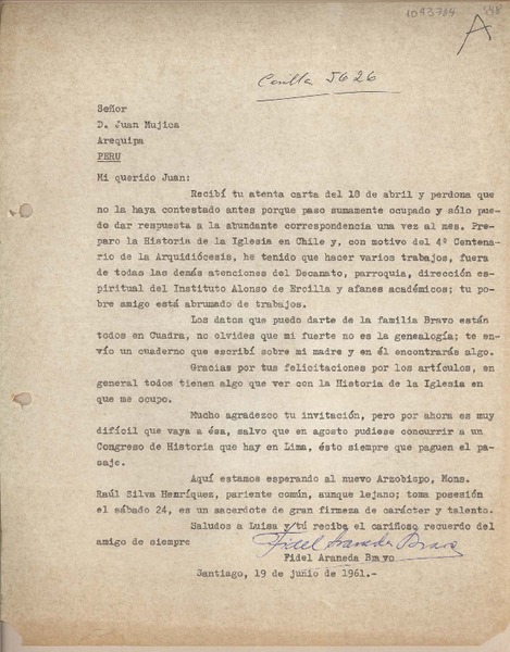 [Carta] 1961 junio 19, Santiago, Chile [a] Juan Mujica, Arequipa, Perú [manuscrito] Fidel Araneda Bravo.
