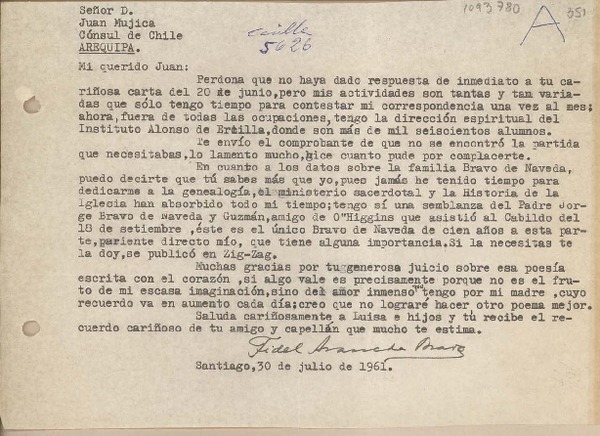 [Carta] 1961 julio 30, Santiago, Chile [a] Juan Mujica, Arequipa, Perú [manuscrito] Fidel Araneda Bravo.