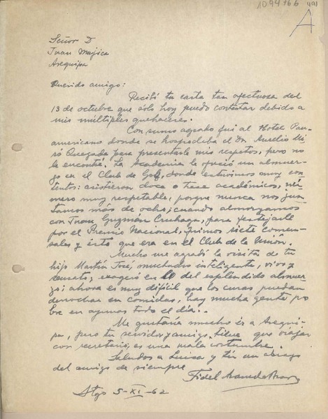 [Carta] 1962 noviembre 5, Santiago, Chile [a] Juan Mujica de la Fuente [manuscrito] Fidel Araneda Bravo.