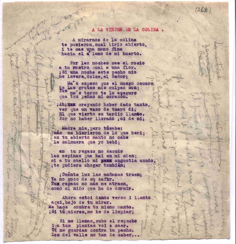 A la Virgen de la colina [manuscrito] Gabriela Mistral.