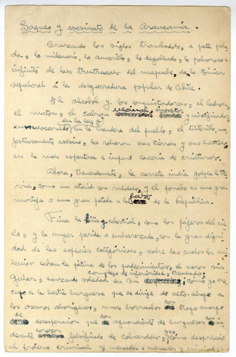 Saqueo y asesinato de la araucanía [manuscrito] Pablo de Rokha.