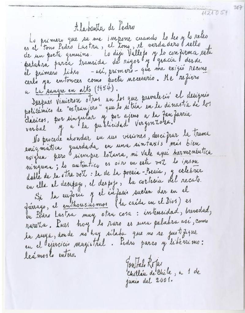 Alabanza de Pedro [manuscrito] Gonzalo Rojas.