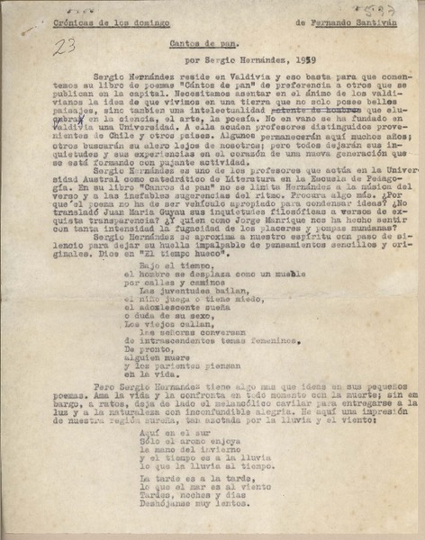 "Cantos de pan" - Manuscritos chilenos - Reseñas de libros - Hernández, Sergio