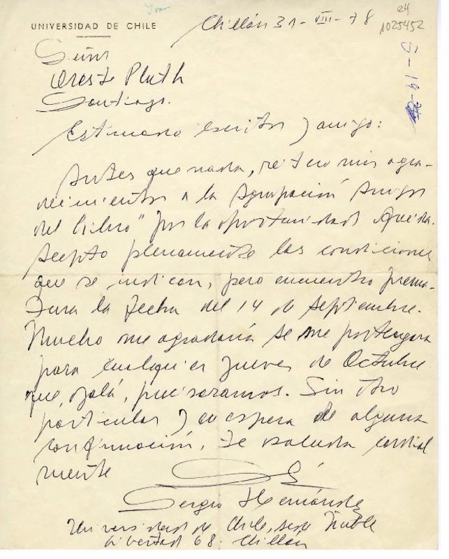 Hernández, Sergio - Correspondencia - Autores chilenos - Manuscritos chilenos - Plath, Oreste