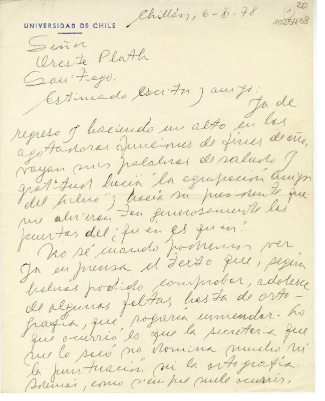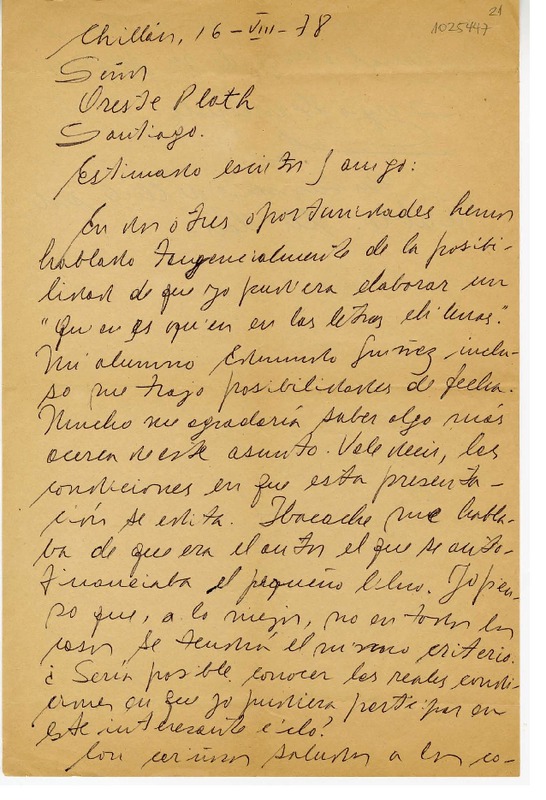 Hernández, Sergio - Manuscritos chilenos - Autores chilenos - Correspondencia - Plath, Oreste