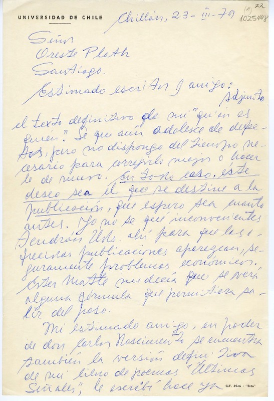 [Carta] 1979 marzo 23, Chillán, Chile [a] Oreste Plath [manuscrito] Sergio Hernández.