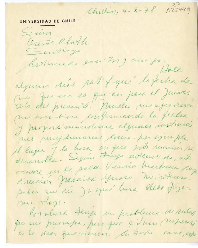[Carta] 1978 octubre 9, Chillán, Chile [a] Oreste Plath [manuscrito] Sergio Hernández.