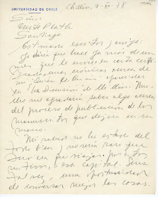[Carta] 1978 diciembre 7, Chillán, Chile [a] Oreste Plath, Santiago, [Chile] [manuscrito] Sergio Hernández.