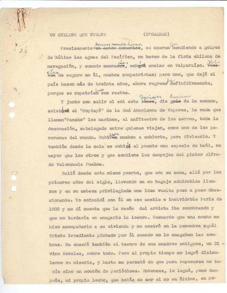 Un chileno que vuelve [manuscrito] Augusto D'Halmar.