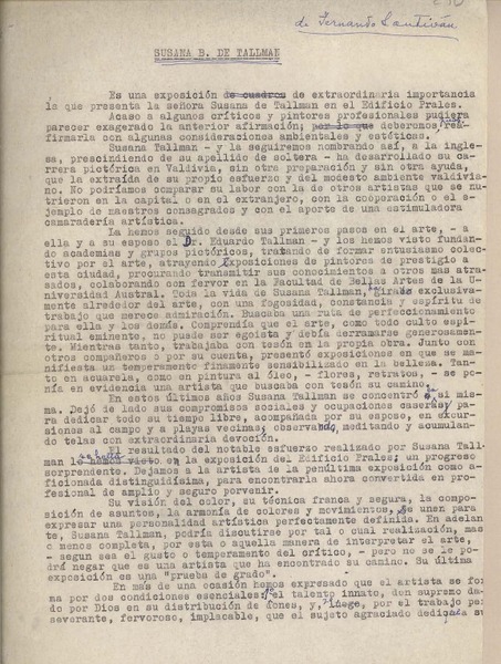 Susana B. de Tallman [manuscrito] Fernando Santiván.
