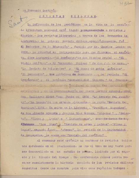 Revistas chilenas [manuscrito] Fernando Santiván.