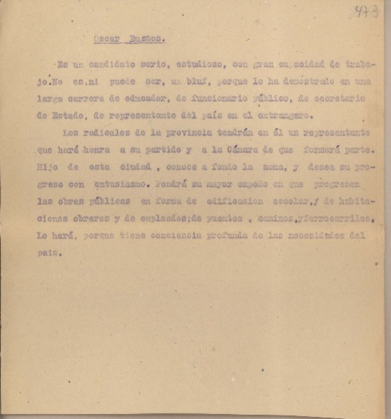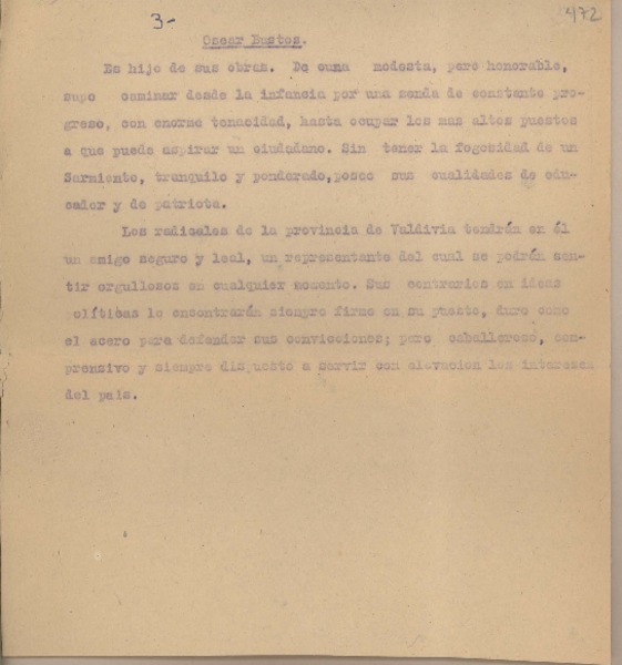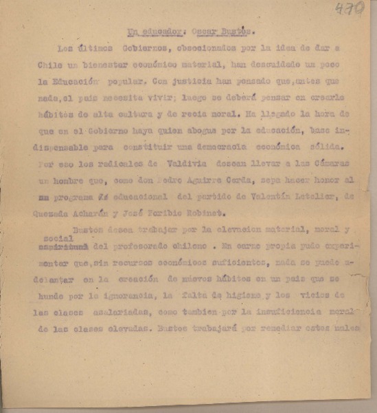 Un educador: Oscar Bustos [manuscrito] Fernando Santiván.