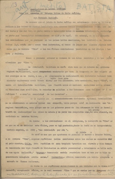 Revoluciones en Latino América [manuscrito] Fernando Santiván.