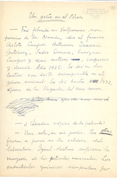 Un grito en el mar [manuscrito] Joaquín Edwards Bello.