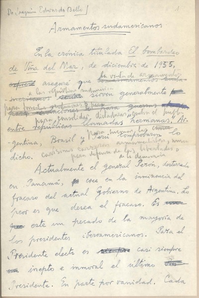 Armamentos sudamericanos [manuscrito] Joaquín Edwards Bello.