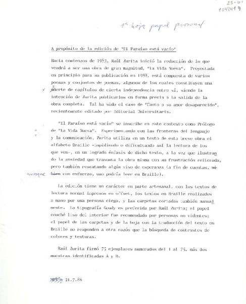 A propósito de la edición de "El Paraíso está vacío" [manuscrito] Marío Fonseca Velasco.