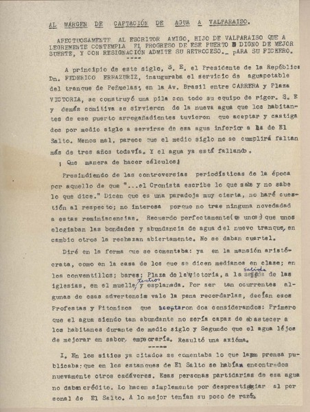 Al margen de captación de agua a Valparaíso [manuscrito] Carlos Rojas Contreras.