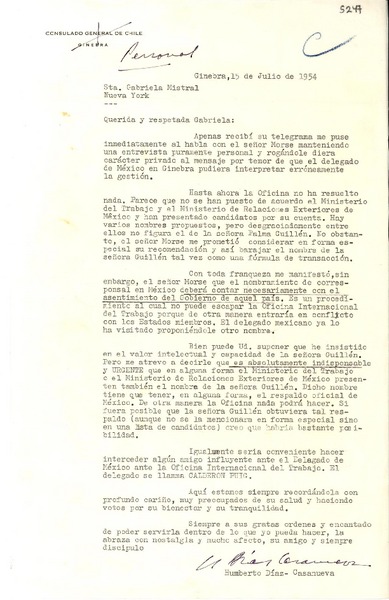 [Carta] 1954 jul. 15, Ginebra, [Suiza] [a] [Gabriela Mistral] [manuscrito] Humberto Díaz-Casanueva.