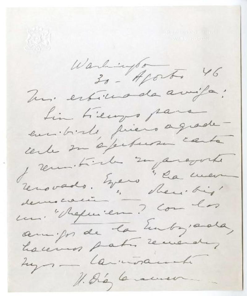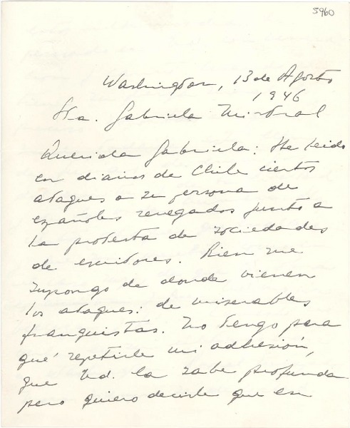 [Carta] 1946 ago. 13, Washington, [EE.UU.] [a] Gabriela Mistral [manuscrito] [Humberto] Díaz-Casanueva.