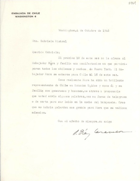 [Carta] 1946 oct. 4, Washington, [EE.UU.] [a] Gabriela Mistral [manuscrito] [Humberto] Díaz-Casanueva.