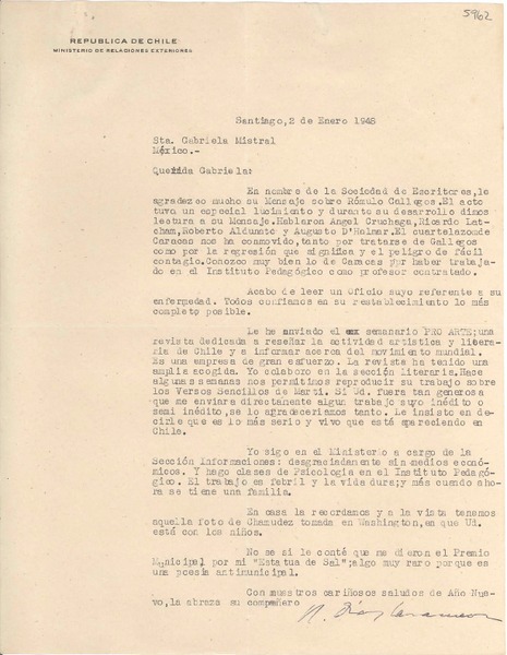 [Carta] 1948 ene. 2, Santiago, [Chile] [a] Gabriela Mistral, México [manuscrito] [Humberto] Díaz-Casanueva.