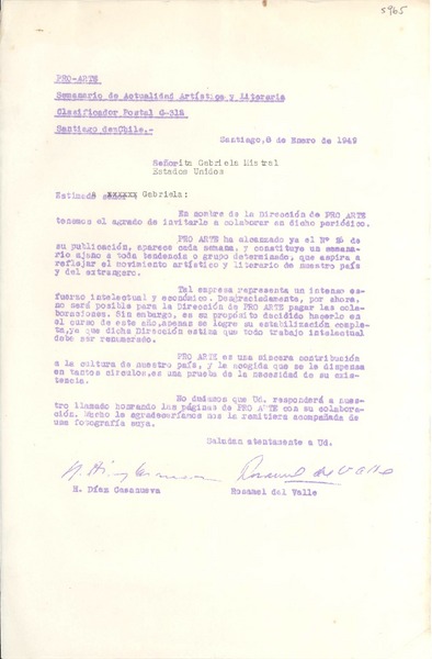 [Carta] 1949 ene. 8, Santiago, [Chile] [a] Gabriela Mistral, Estados Unidos [manuscrito] [Humberto] Díaz-Casanueva, Rosamel del Valle.