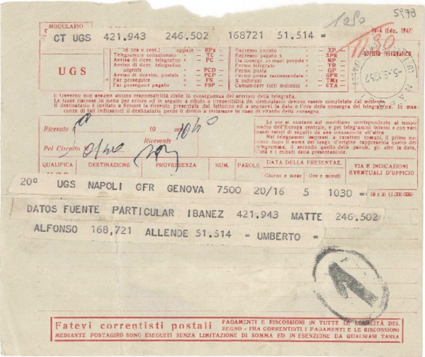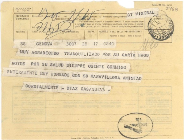 [Telegrama] 1950 mayo 17, Génova, [Italia] [a] Gabriela Mistral, Nápoles, [Italia] [manuscrito] [Humberto] Díaz-Casanueva.