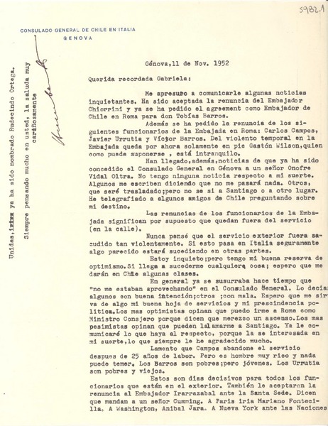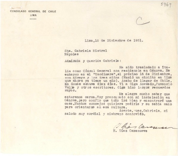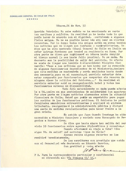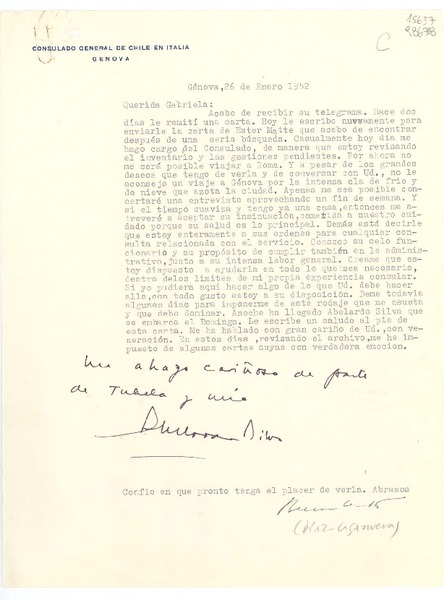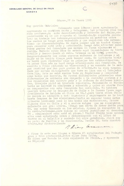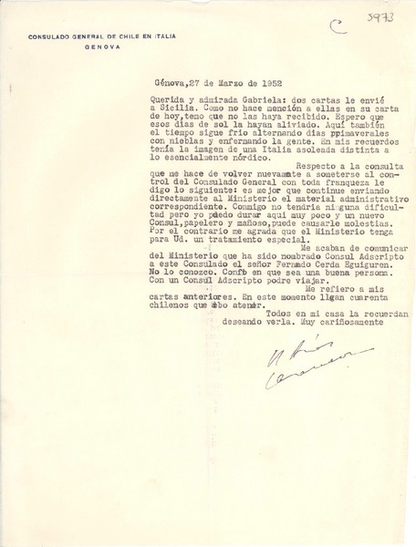 [Carta] 1952 ene. 26, Consulado General de Chile, Génova, Italia [a la] Querida Gabriela, [Italia] [manuscrito] Humberto Díaz-Casanueva.